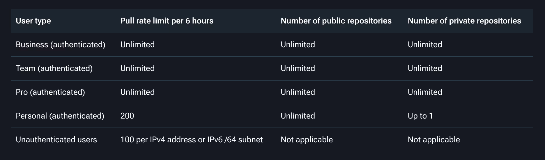 Docker Hub enforces pull limits that affect many developers and CI pipelines. Unauthenticated users are limited to 100 pulls per 6 hours per IP. Even authenticated users on the free plan are limited to 200. These limits can slow down builds, break automation, and block production.