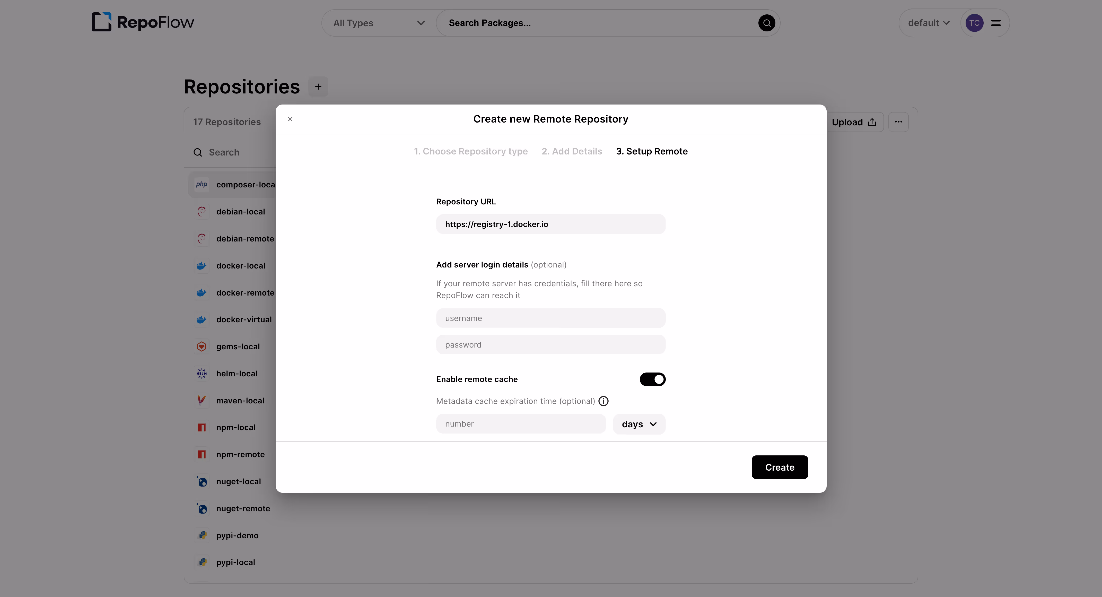 With RepoFlow, you can create a remote Docker repository that points to Docker Hub or any other registry. This acts as a smart cache, storing pulled images locally.